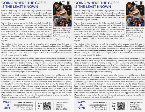 We can include your church logo, as well as the missionaries, ministries, and fields your church supports. Simply email us by March 5, 2025, using the link below.