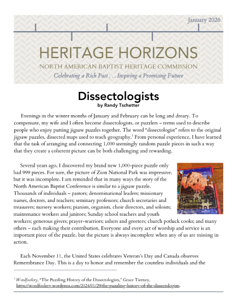 Heritage Horizons – the newsletter of the NAB Heritage Commission – was first published in 1992 and is distributed to churches and individuals interested in denominational history and the work of Heritage Commission personnel. Heritage Horizons is available upon request in both electronic and hard-copy formats. (Use this link to sign up for the email.) Past issues can be viewed by clicking on the links below.